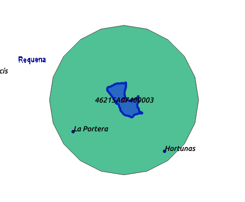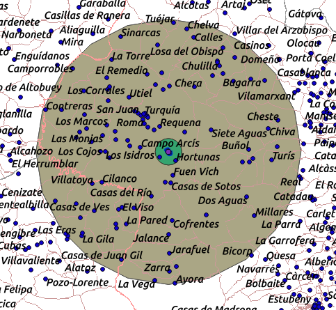 Búsqueda de los núcleos de población situados entre 4km y 40km de la parcela catastral. Distancia en línea recta medida sobre la proyección en un plano horizontal. Este componente P2, aunque sigue siendo relevante, se reduce en su influencia relativa debido a su mayor alcance.