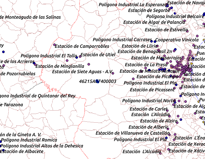 Centros de comunicación y de transporte obtenidas a través de la capa de redes de Transporte del Centro de descargas CNIG